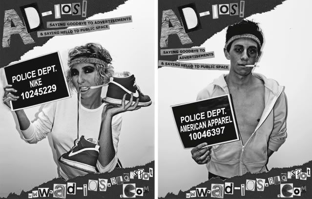 As a protest against the unwanted proliferation of advertisements across the city of Toronto and the proposed bylaw which will constrain posterization, the AD-ios! team have created a series of posters to place across city streets. These posters depict some of the recent ad campaigns which have plagued Toronto's space, from American Apparel to CTV's Canada's Next Top Model. However, they are no longer on the large and bright billboards which tower over city sidewalks, attracting impressionable and prodcut hungry consumers. Now, with only one phone call, they're broken, bruised and beaten as they pose for their prison mugshots, their last 15 minutes of fame, before they are carried off to their cells. If only this were the reality!